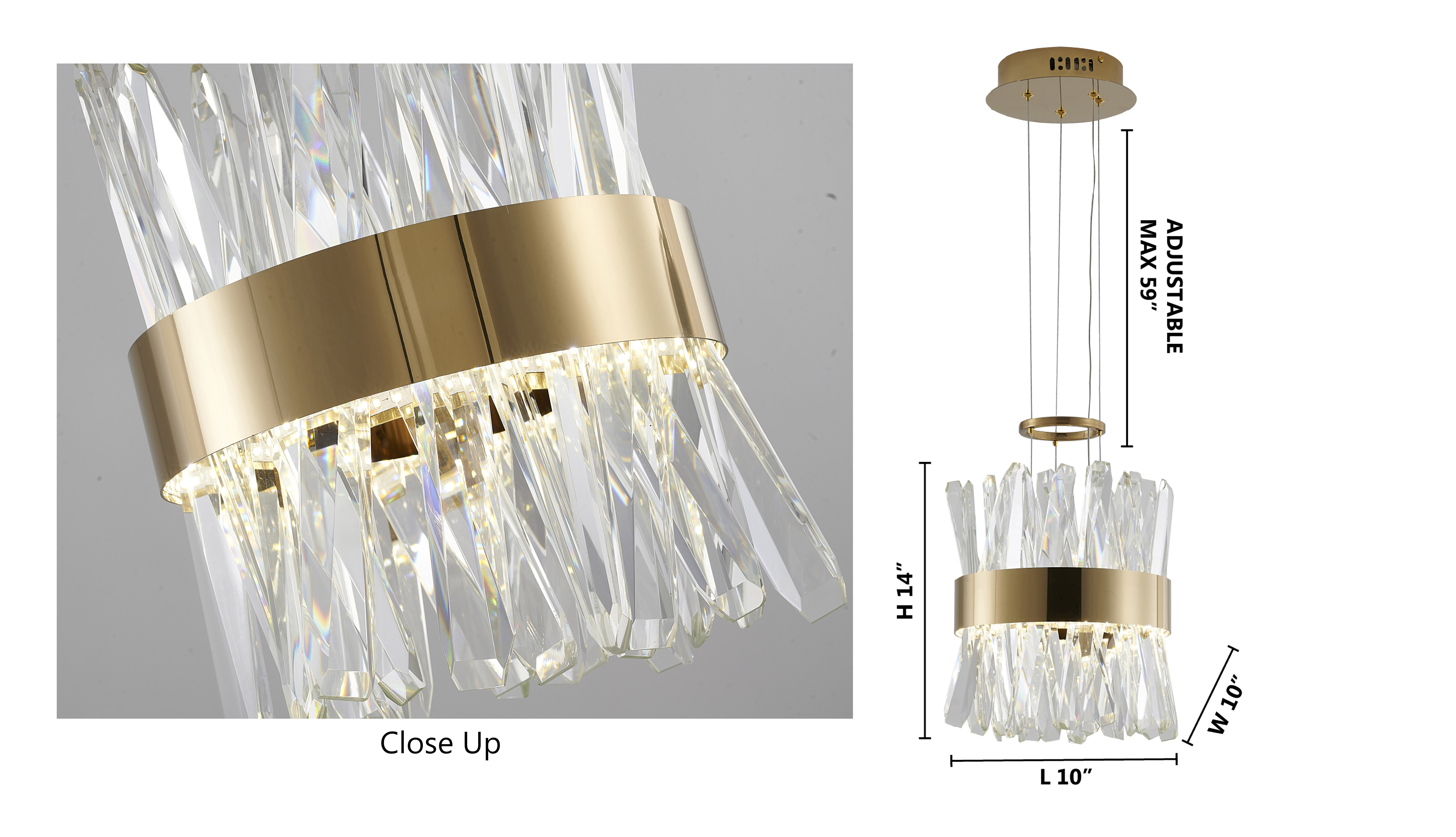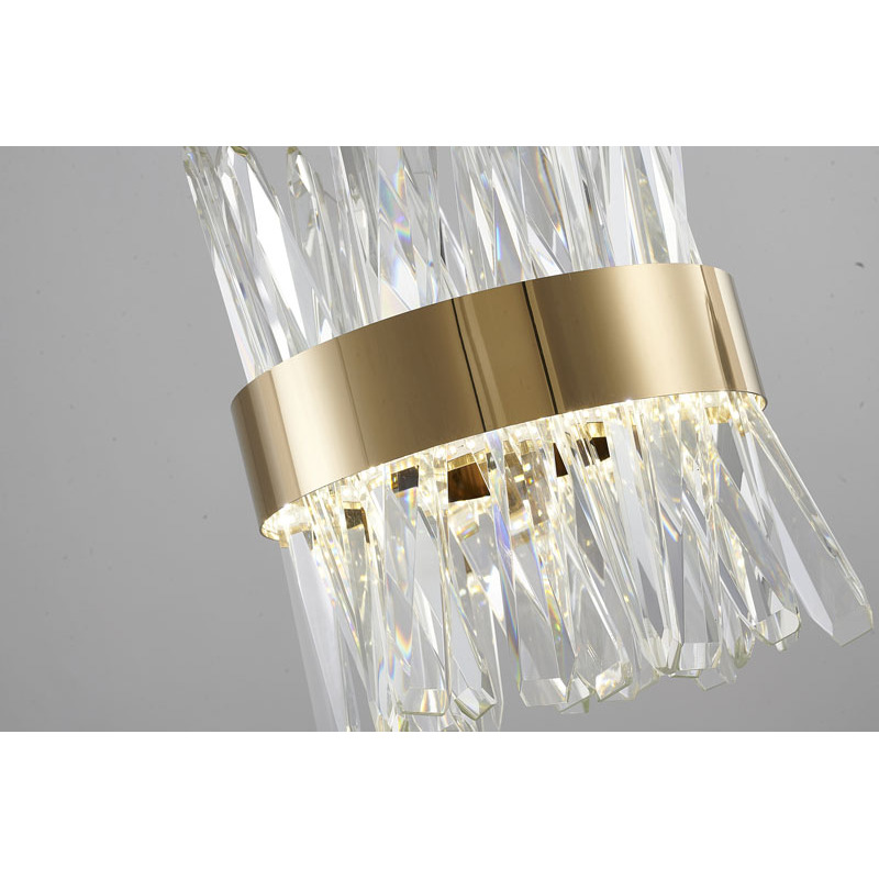 A GOLD STAINLESS STEEL FRAME LED PENDANT WITH CLEAR CRYSTALS
