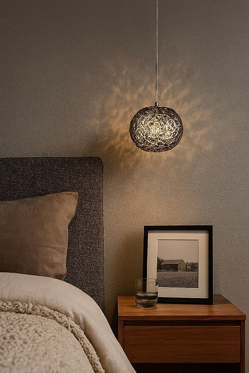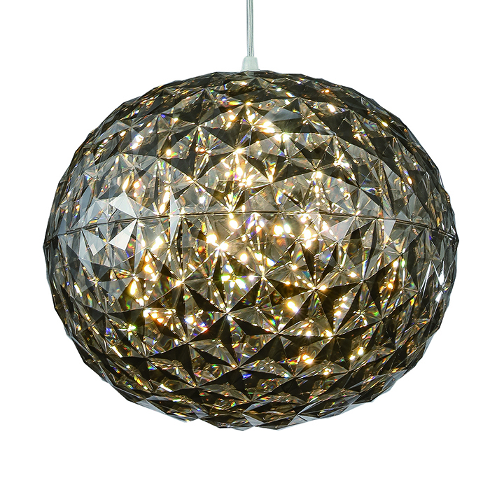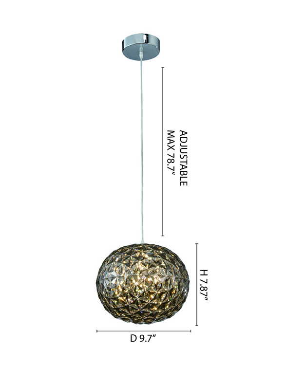 A SMOKE COLOR ORB ACRYLIC SINGLE PENDANT LIGHT WITH CHROME METAL HARDWARE