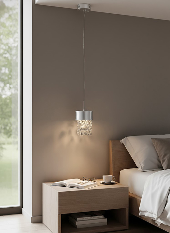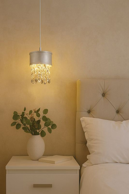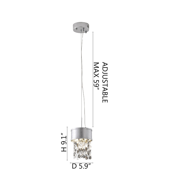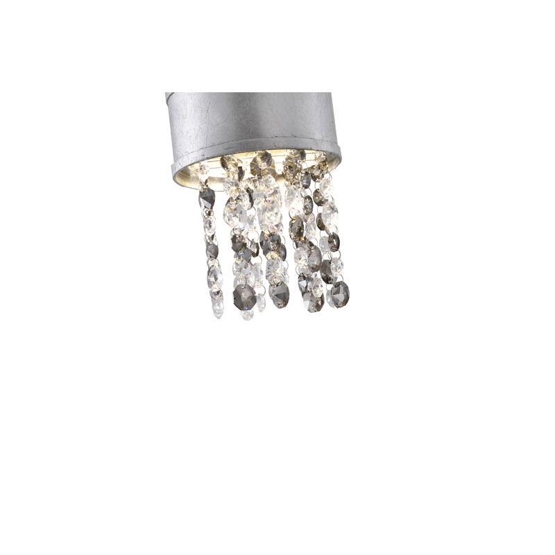 A SILVER LEAF FRAMED PENDANT LIGHT WITH CLEAR AND SMOKE HANGING CRYSTALS