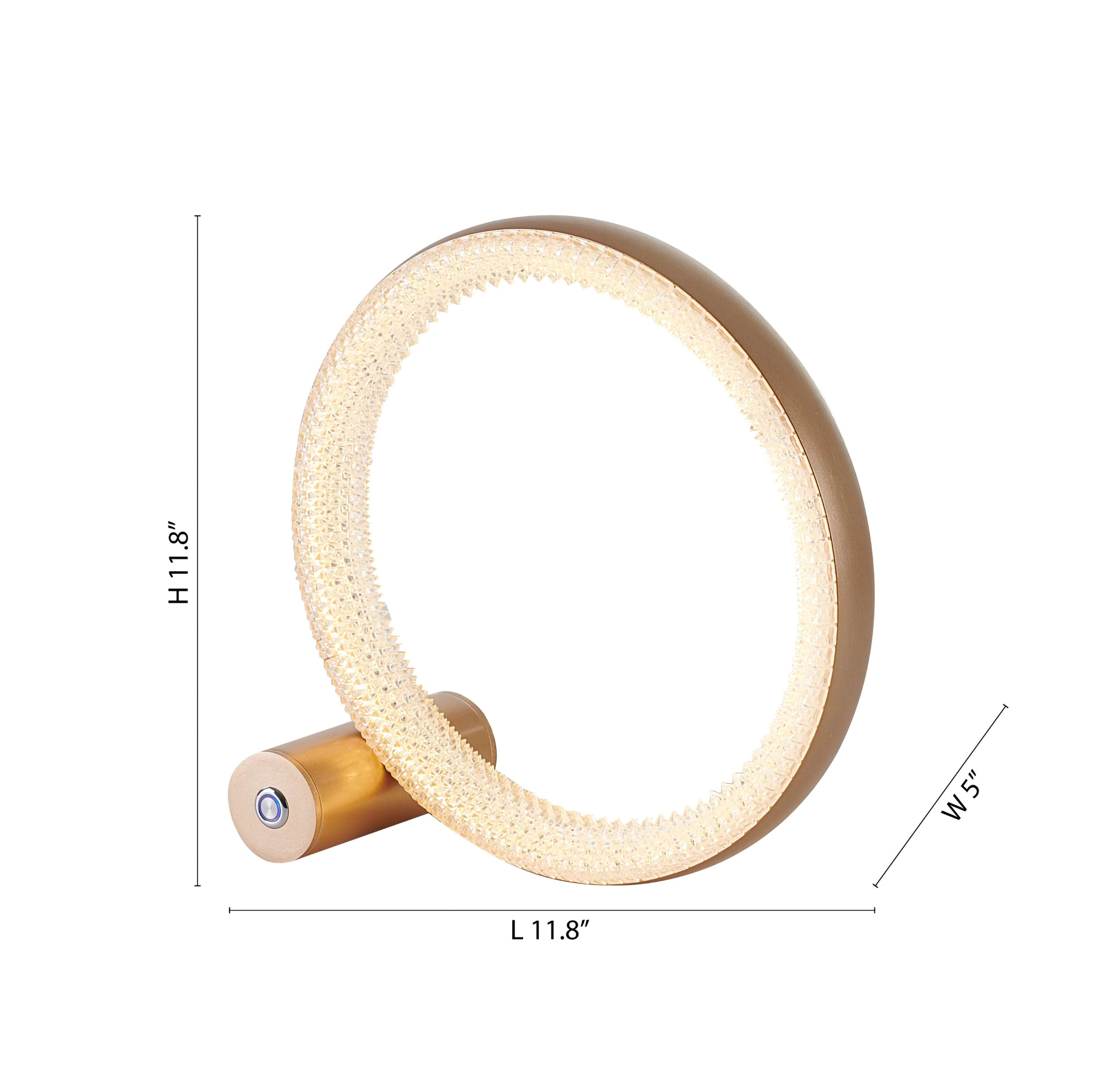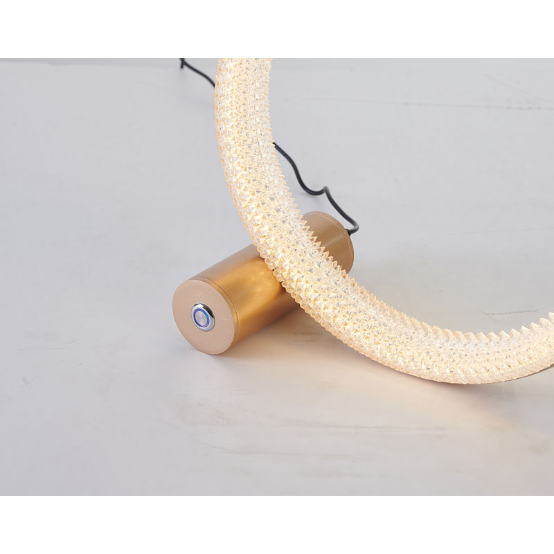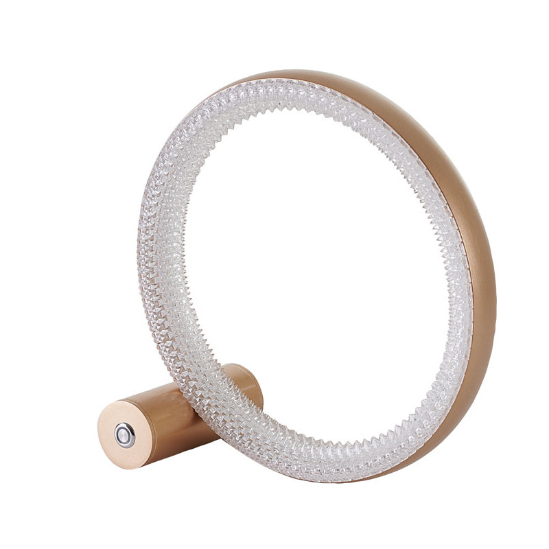 A ROUND GOLD FRAMED LED TABLE LAMP WITH A CLEAR ACRYLIC DIFFUSER