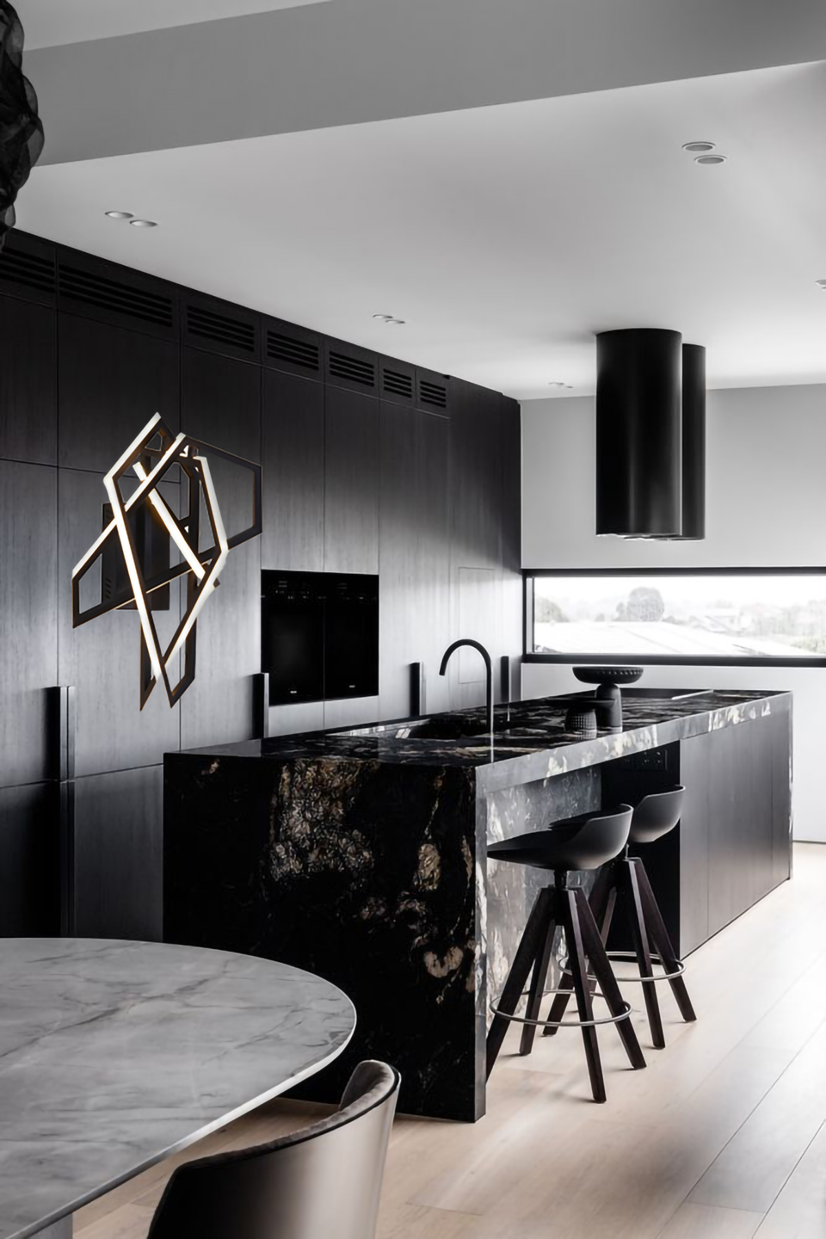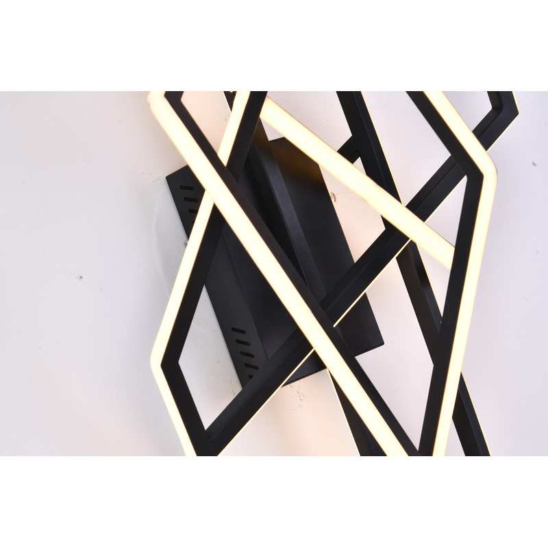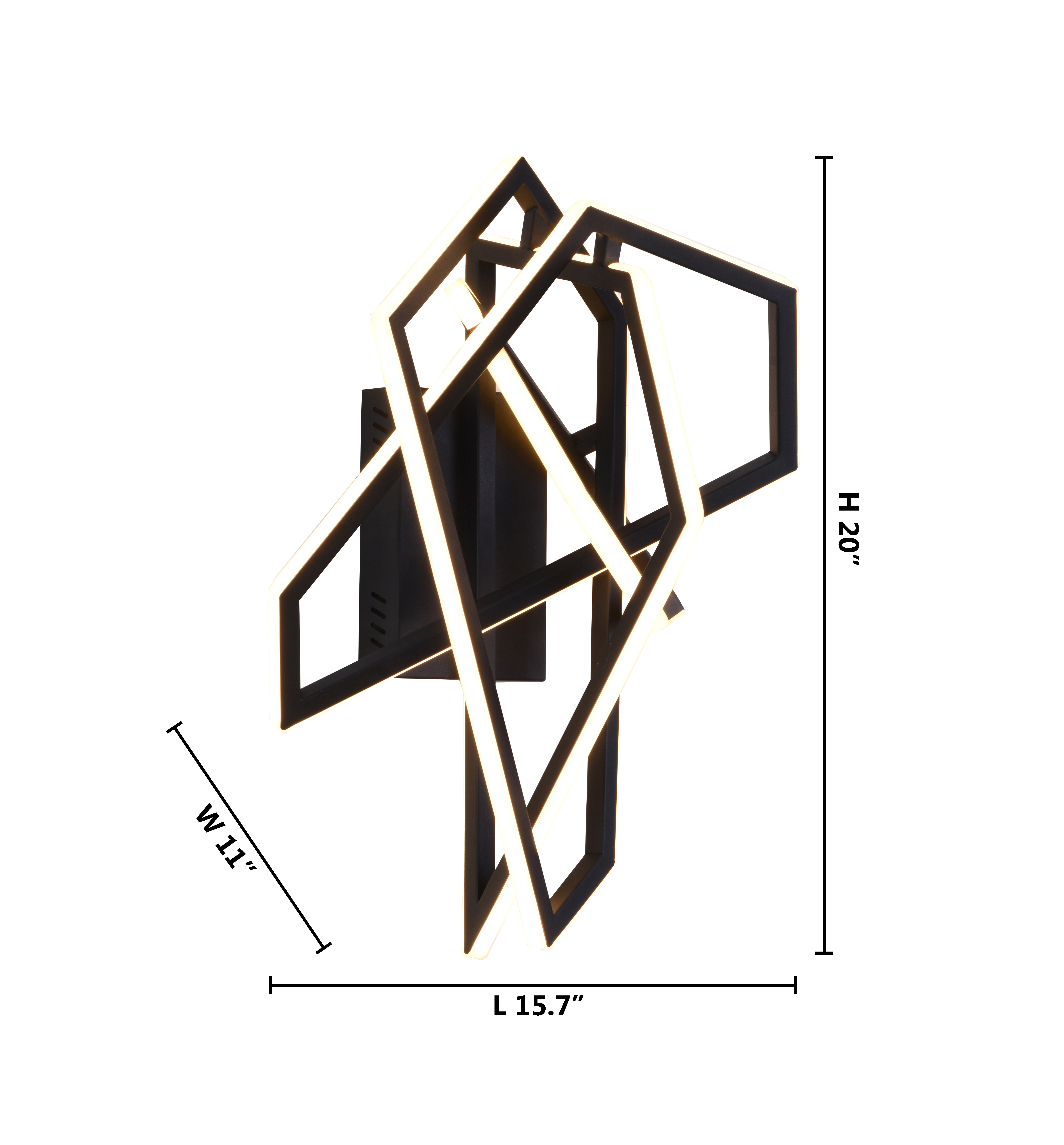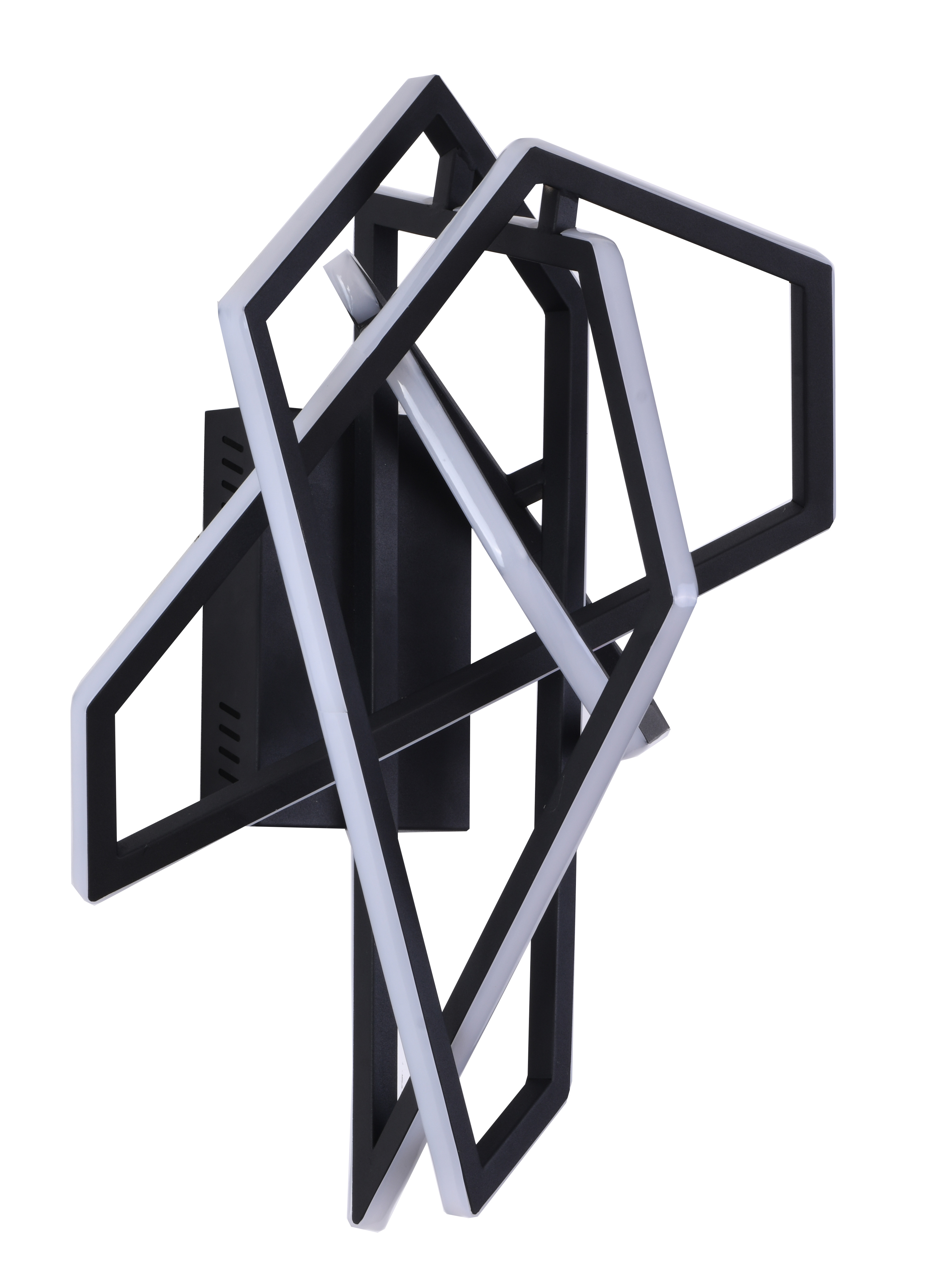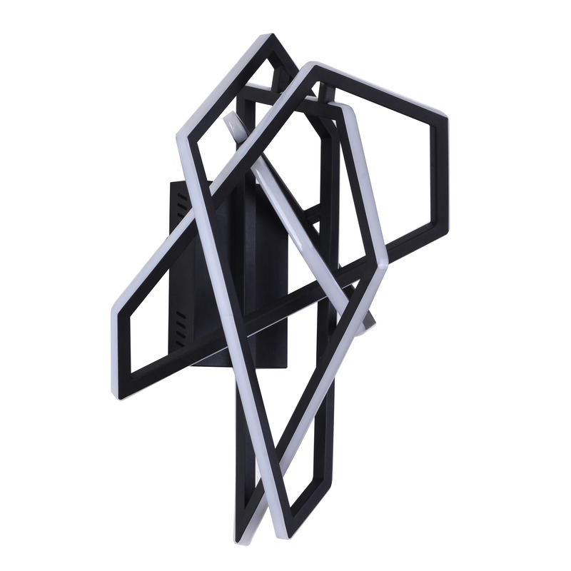 A MATTE BLACK GEOMETRIC STAINLESS STEEL WALL SCONCE WITH A WHITE ACRYLIC DIFFUSER