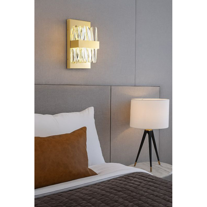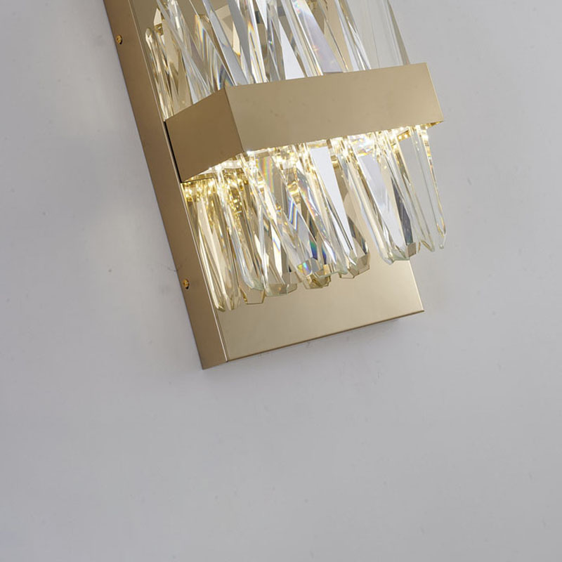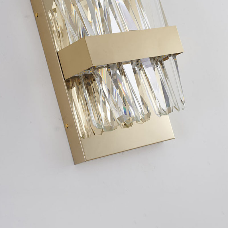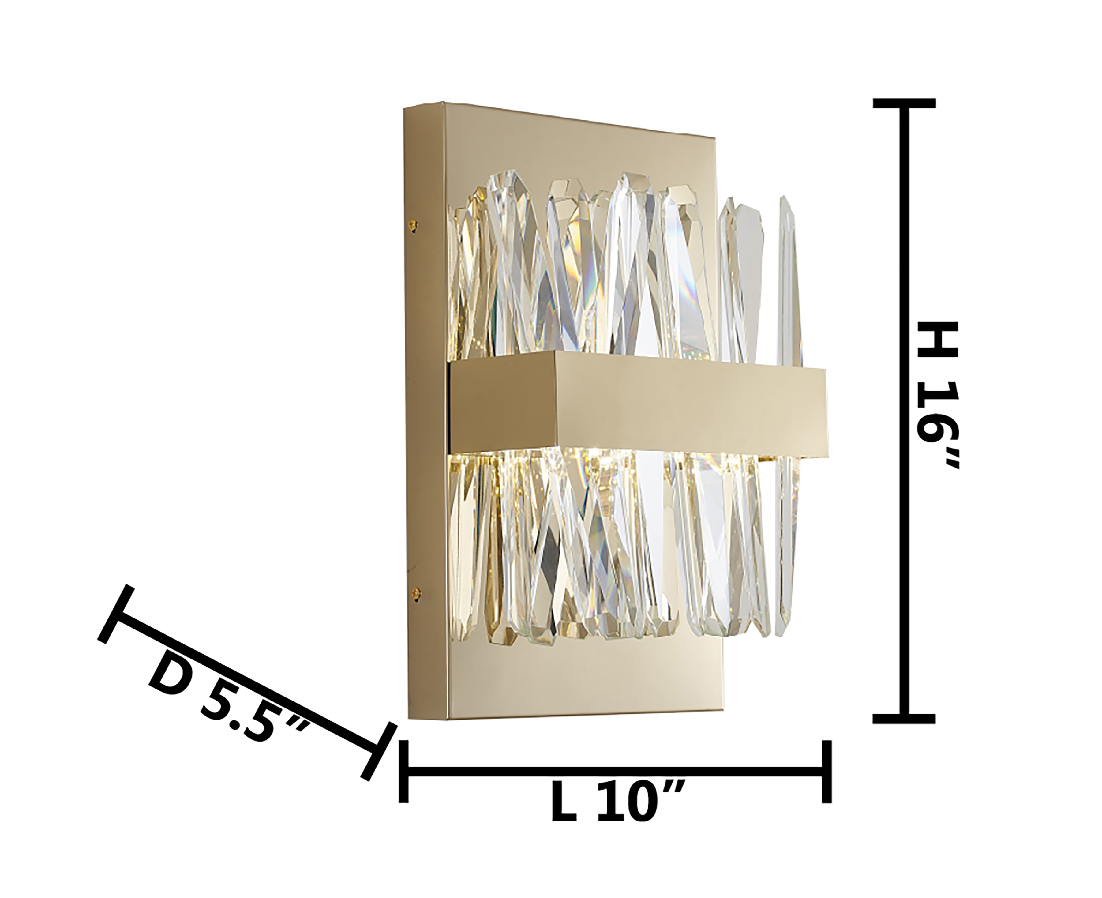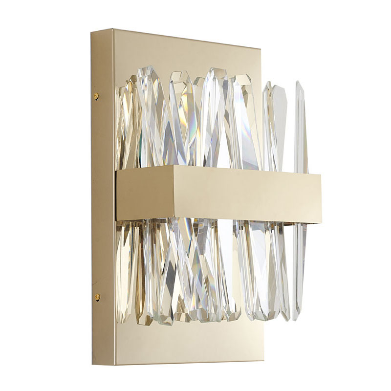 A GOLD STAINLESS STEEL WALL SCONCE WITH CLEAR CRYSTALS