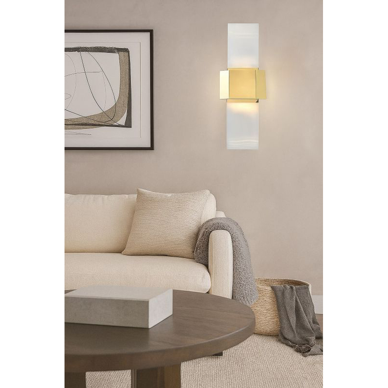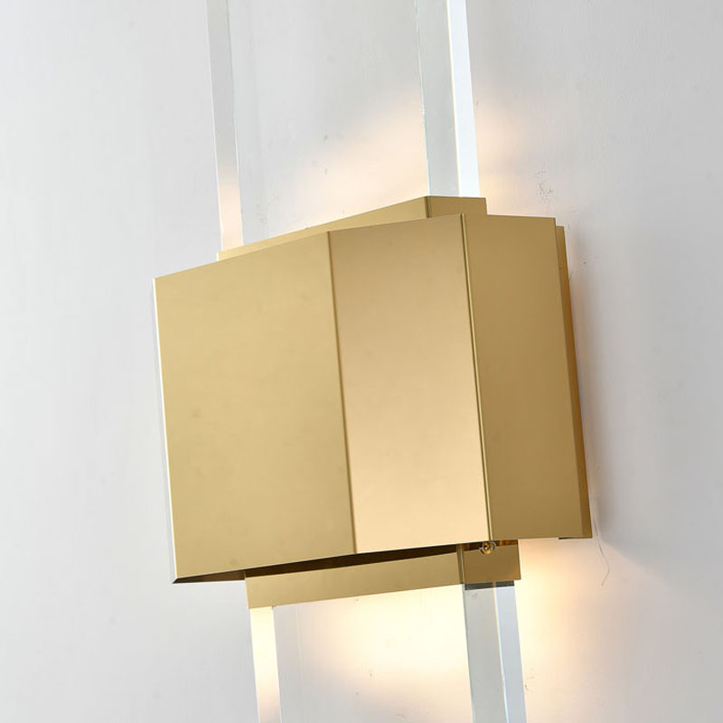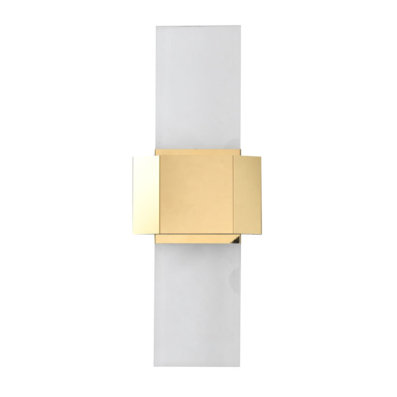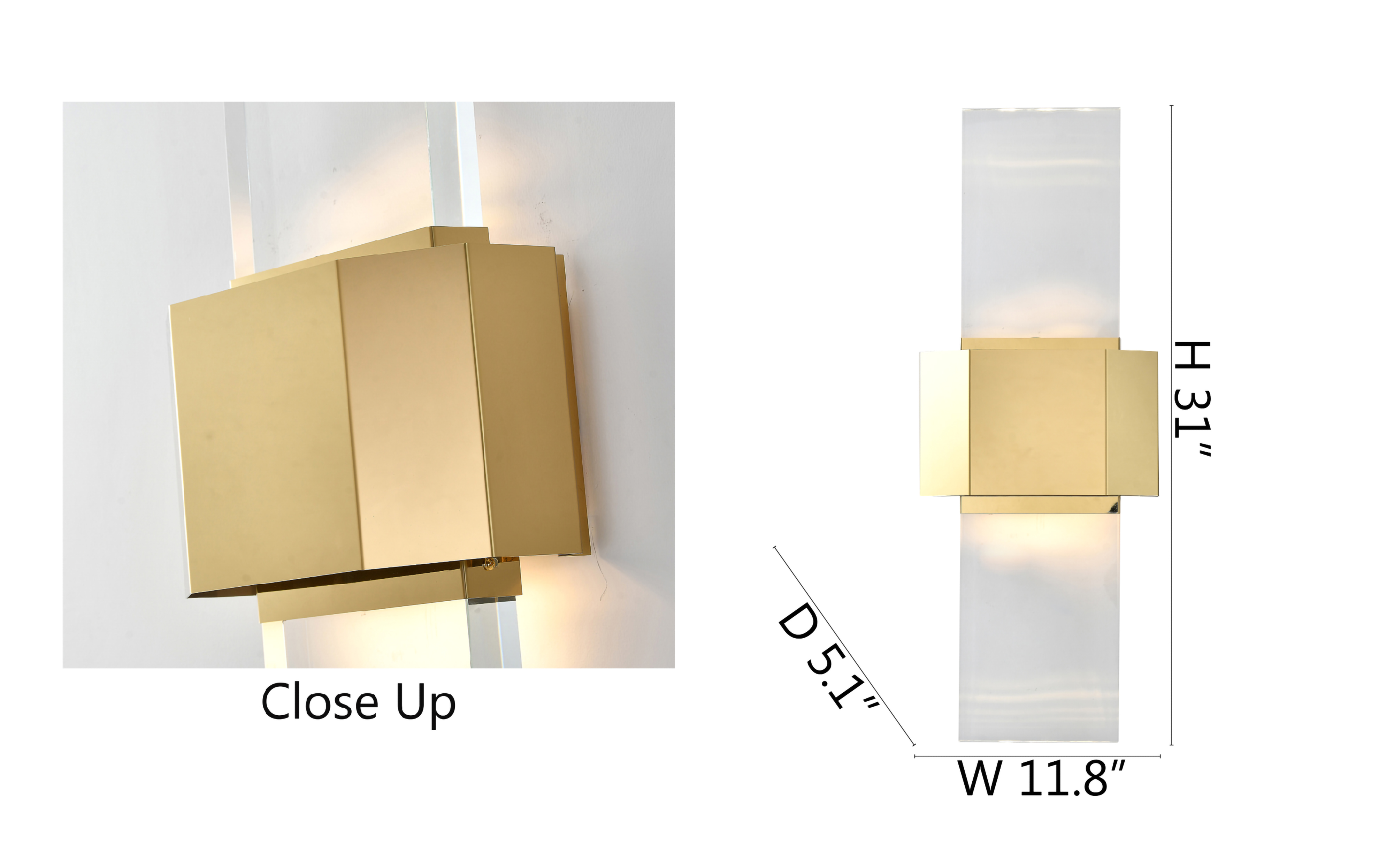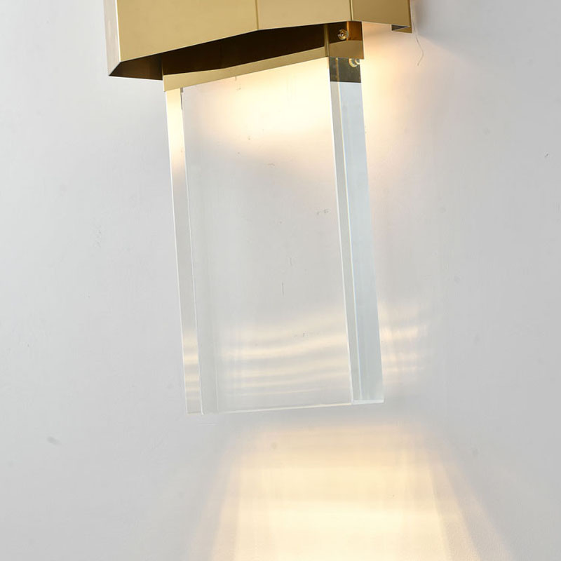 A GOLD STAINLESS STEEL FRAME LED WALL SCONCE WITH CLEAR CRYSTAL BLOCKS