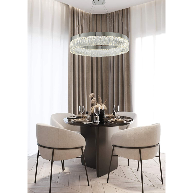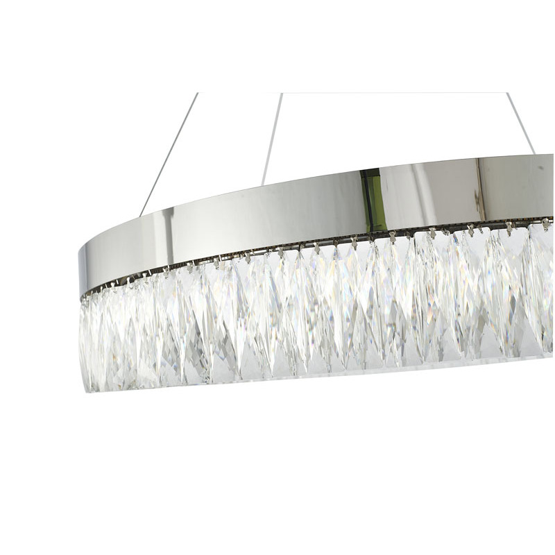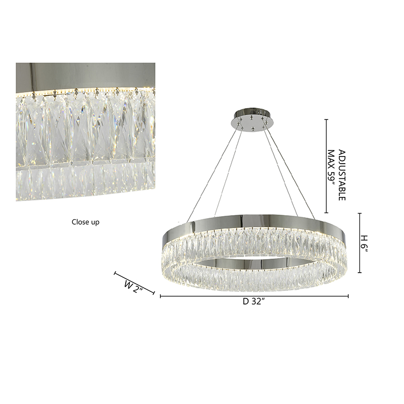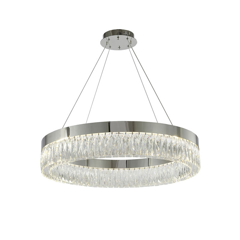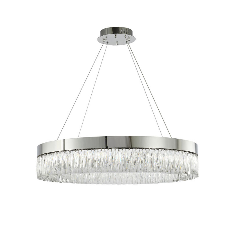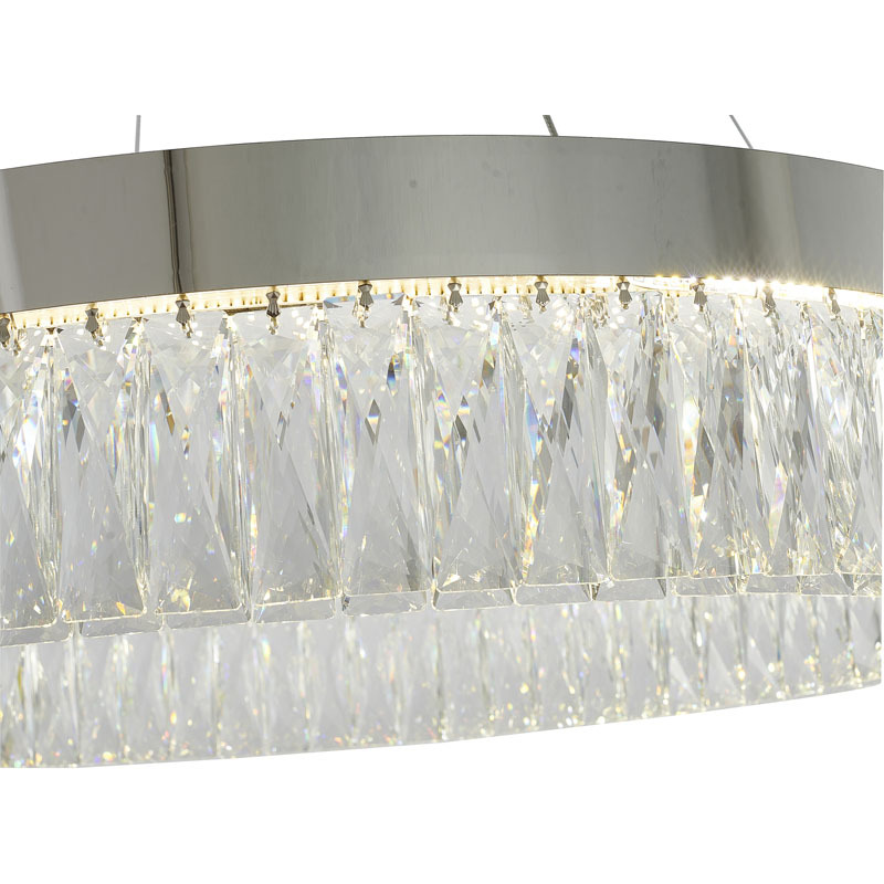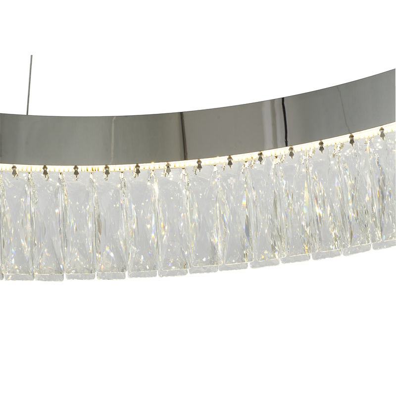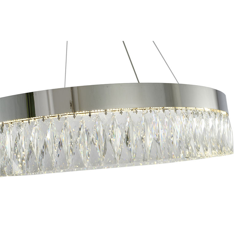 A ROUND CHROME FRAME LED CHANDELIER WITH CLEAR HANGING CRYSTALS