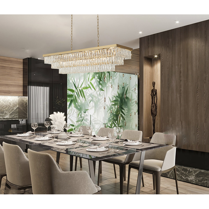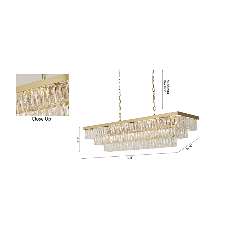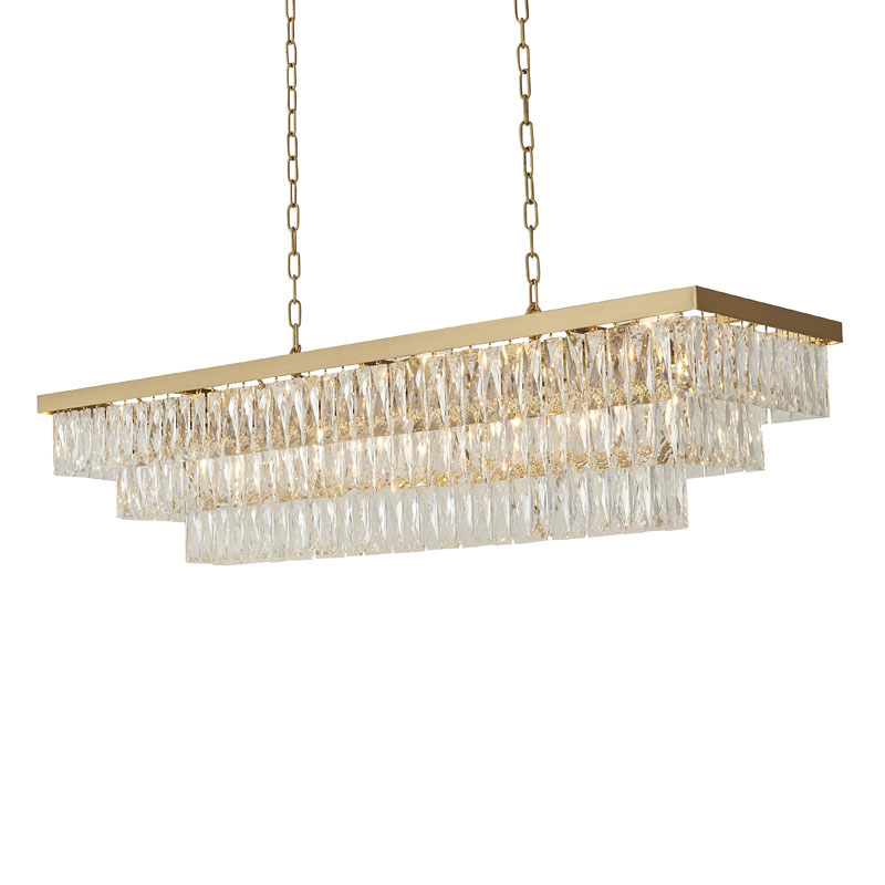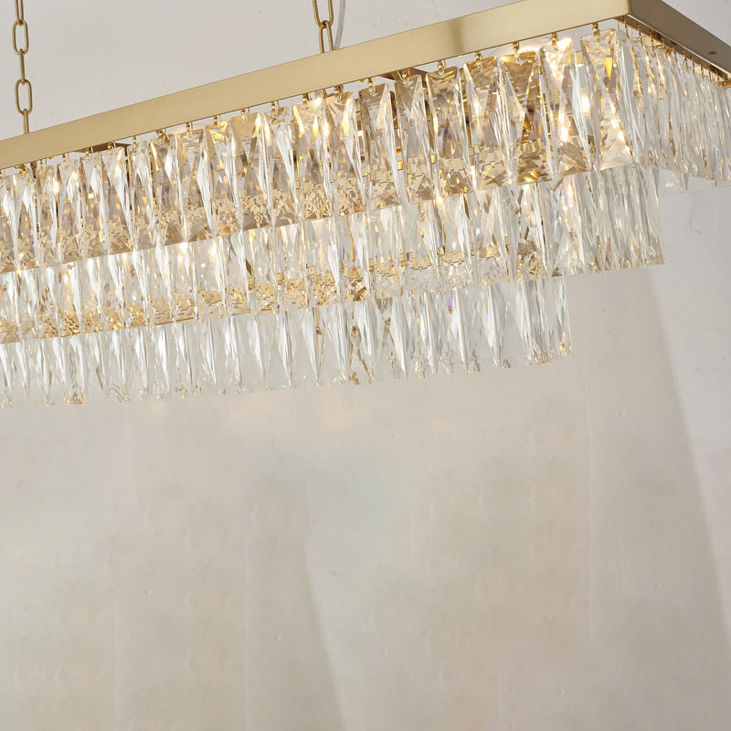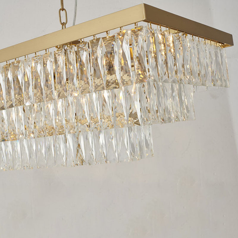 A GOLD RECTANGULAR FRAME CHANDELIER WITH THREE TIERS OF CLEAR HANGING CRYSTALS