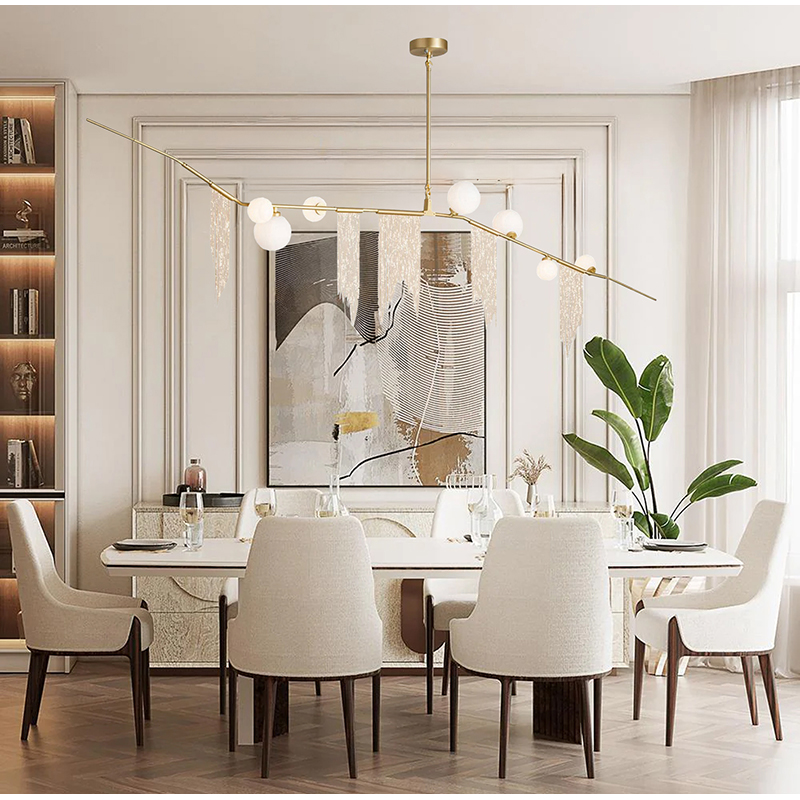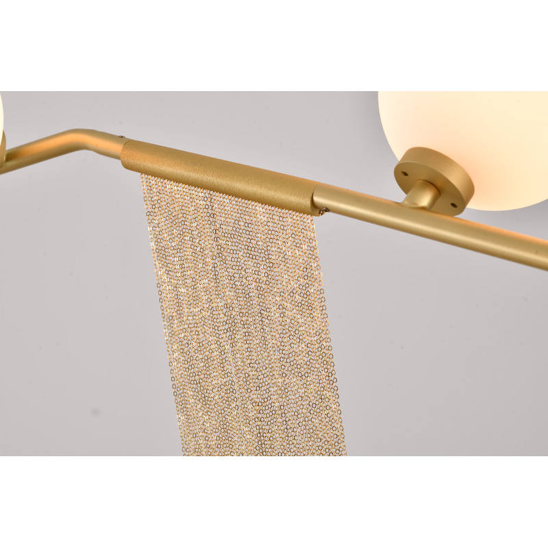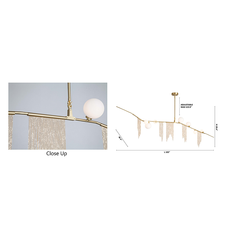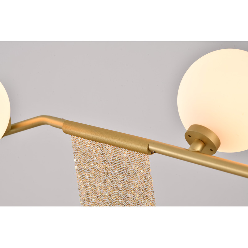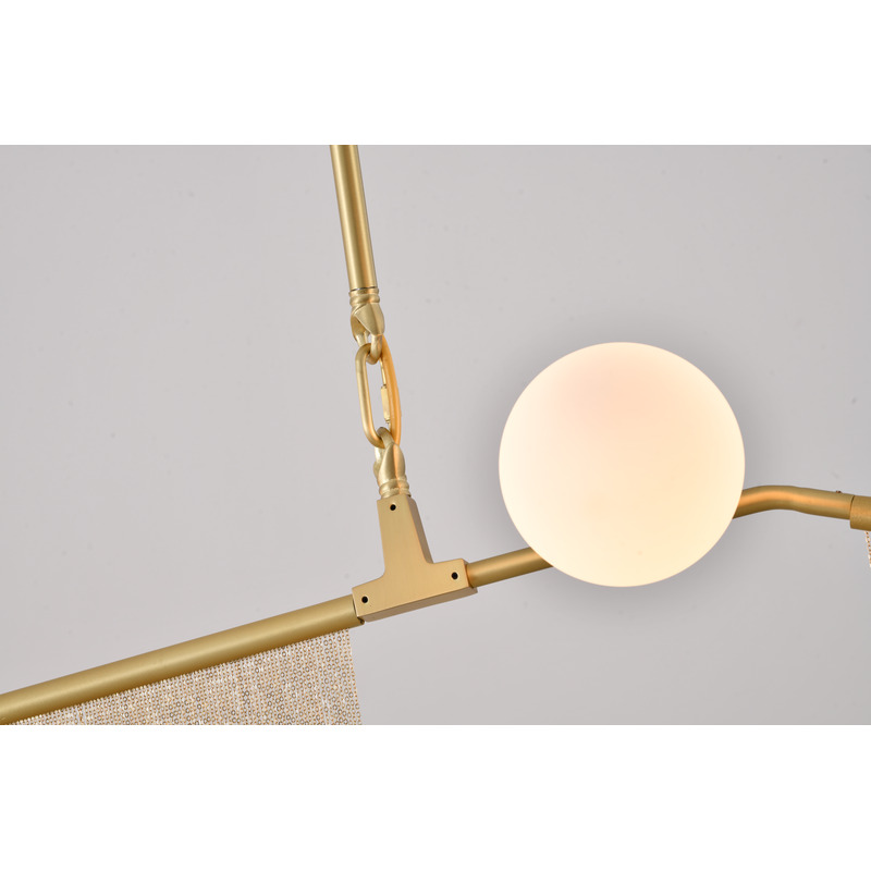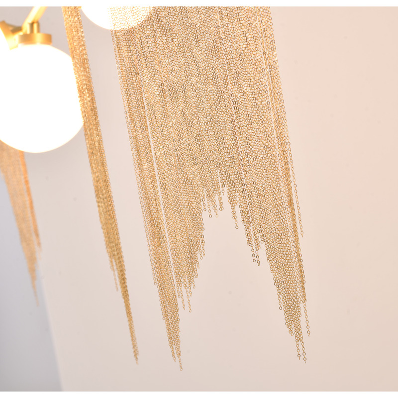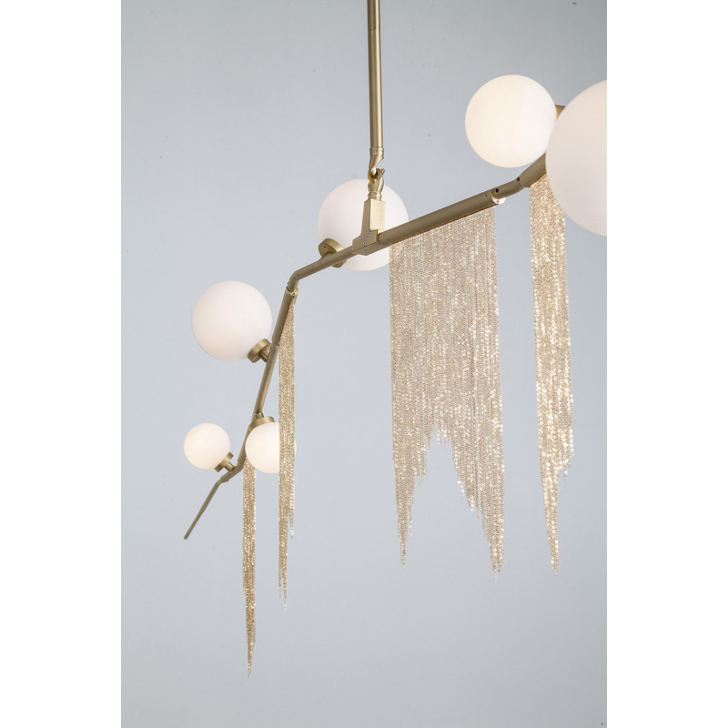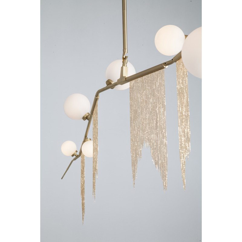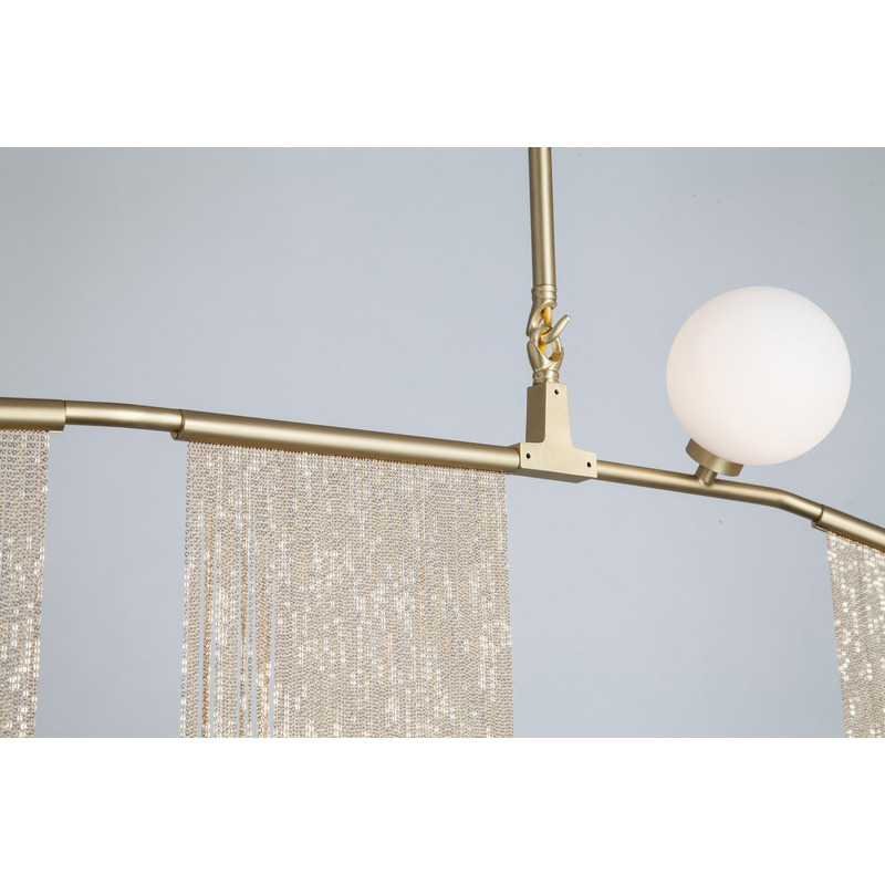 A GOLD METAL FRAME CHANDELIER WITH MILK WHITE GLASS GLOBE SHADES & COPPER CHAIN